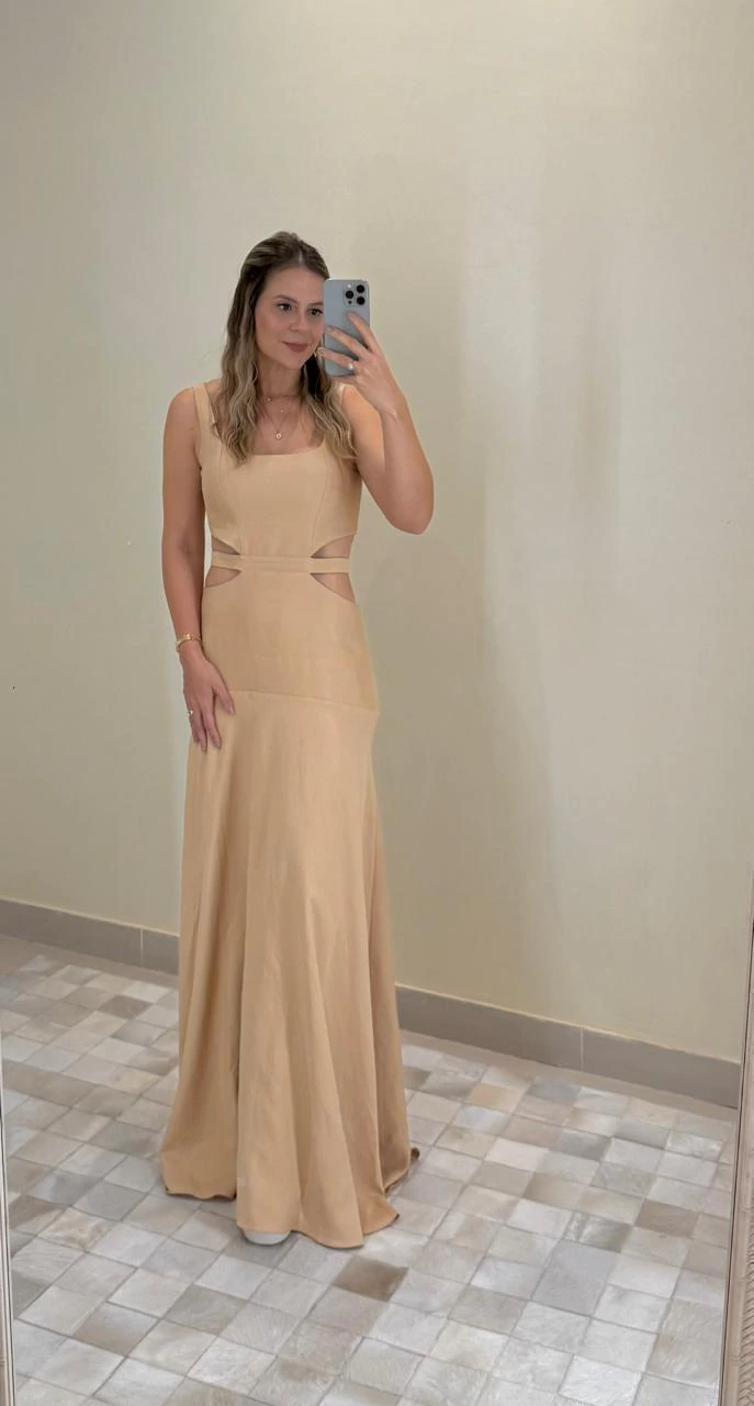 O clássico ganha nova força com os recortes vazados e a amarração nas costas que criam um jogo de sensualidade e elegância. A fluidez da saia contrasta com a estrutura do busto, resultando em um look impactante. Ideal para festas noturnas ou eventos glam, vai bem com salto alto e maxi brincos dourados para um toque de power fashion.